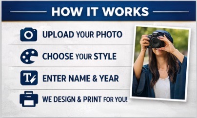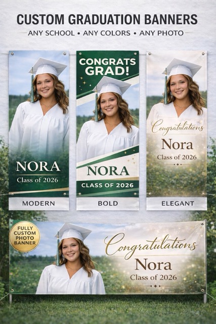 Our custom graduation banners are designed to showcase your favorite photo with a clean, modern layout that looks amazing indoors or outdoors.